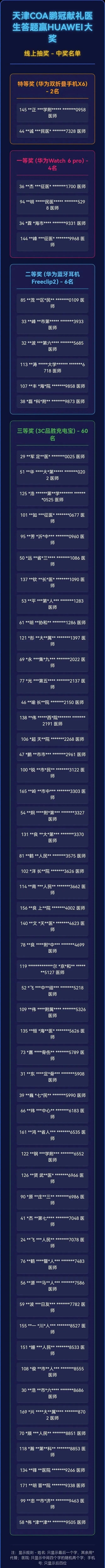 本次活动共计66位幸运医生获奖(有6位因手机空号无法联系取消名额),为确保公平公正,抽奖过程均已记录,所有获奖者均已通过电话或短信通知。