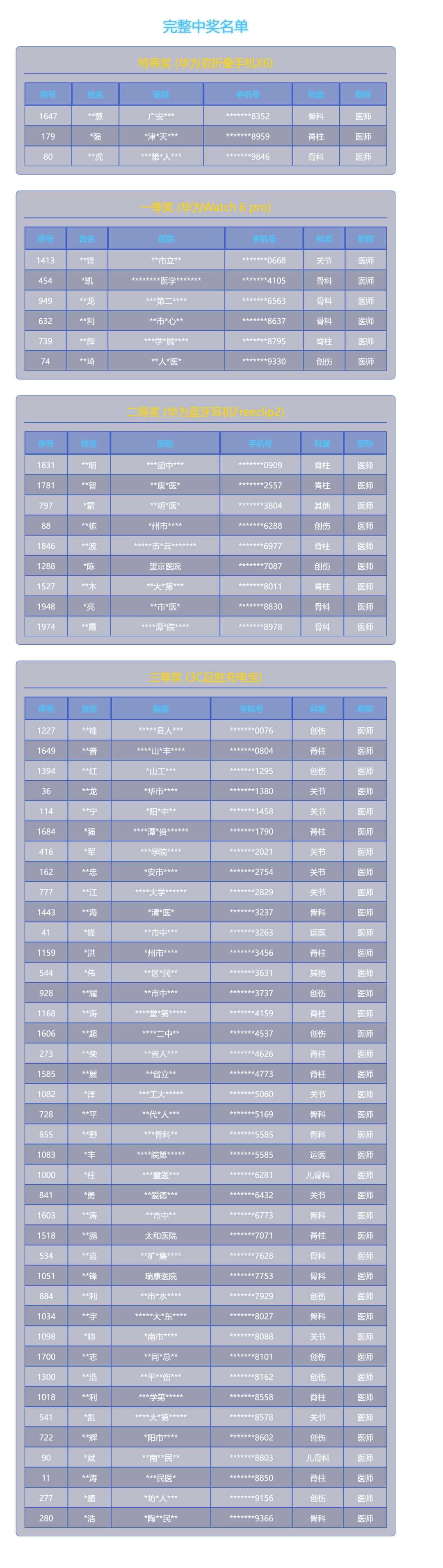 来自西宁市的王教授和广安门医院的住院医师幸运摘得头奖,经现场工作人员验证医生身份后,颁发奖品——华为HUAWEI Mate X6非凡大师手机。多位专家也分别获得了华为平板、智能手表等精美礼品。获奖者与鹏冠工作人员亲切交流、合影留念,现场气氛热烈融洽。完整中奖名单如下: